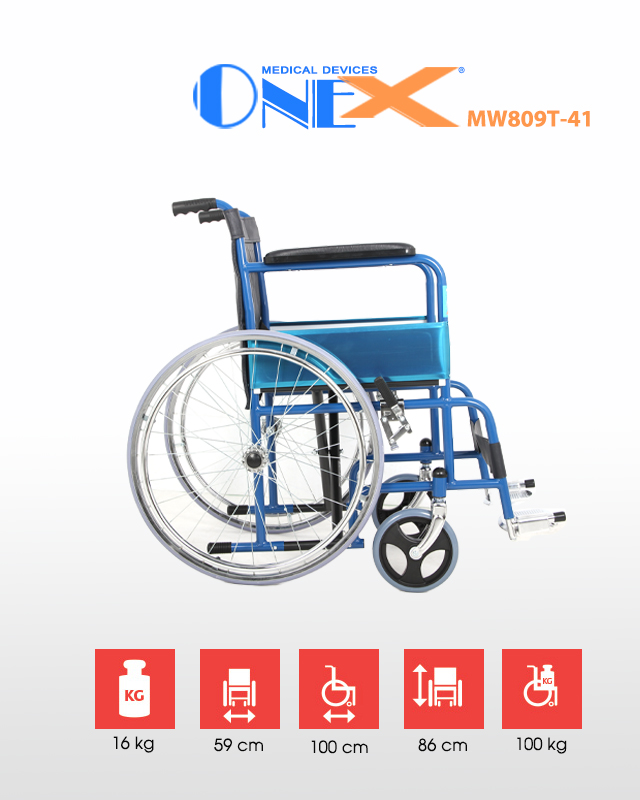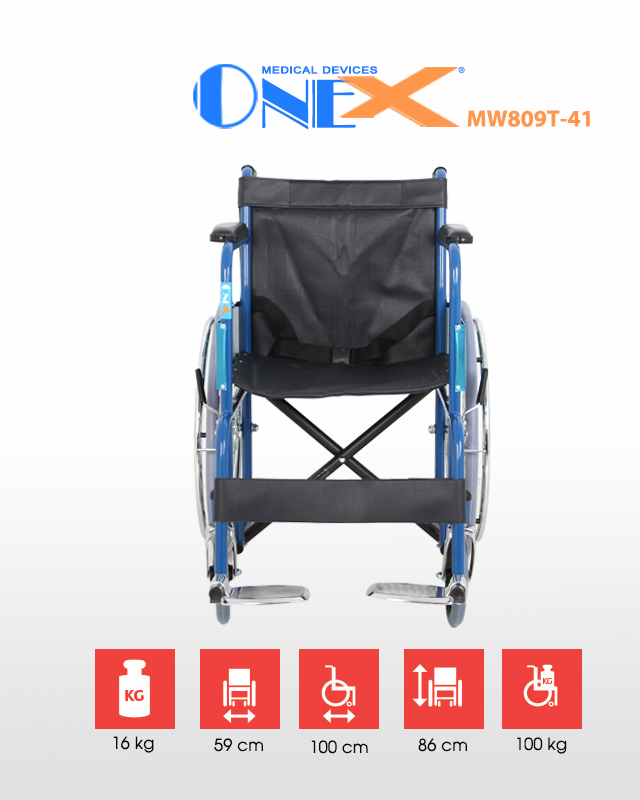 Xe lăn tay ngồi, khung sơn màu xanh, nệm simili rộng 41 cm.